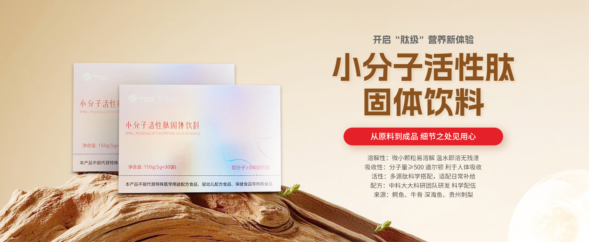 甄选深海鱼、贵州刺梨、鳄鱼皮、牛骨等原料,采用现代分子定向酶切及特定小肽分离纯化技术制成,肽分子≥500 道尔顿。