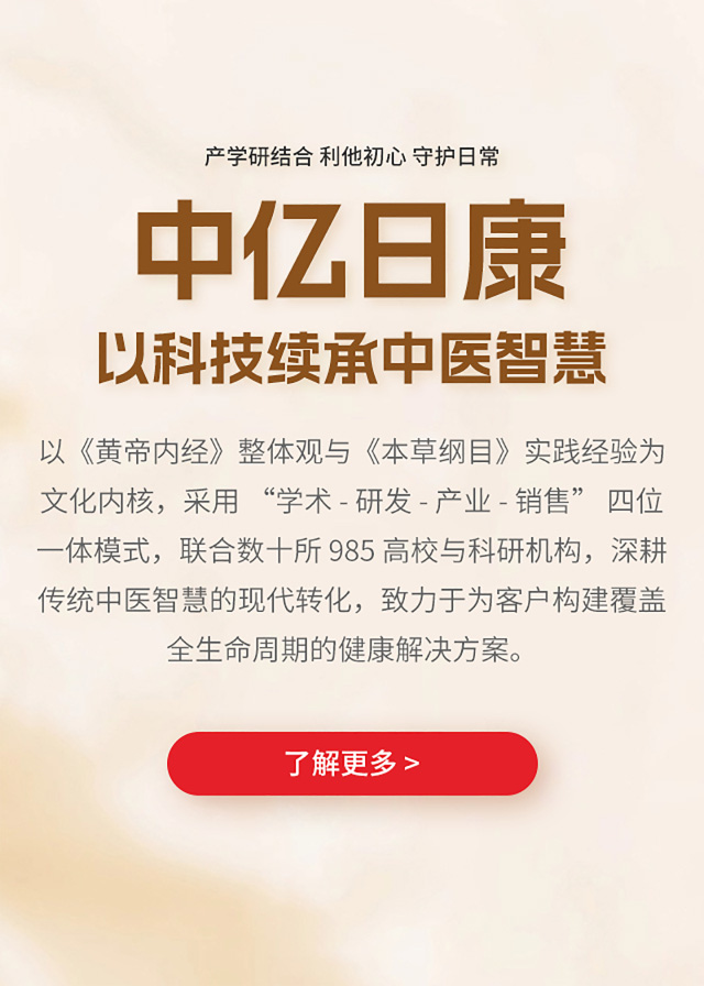浙江中亿日康生物科技有限公司成立于2016年,恰逢中国大健康产业崛起之际,作为国家药食同源行业标准制定企业之一,企业秉持“利他、利国、利民、利家”的核心文化,以中医药的配方传承结合现代中草药萃取技术为根本,联合中国医学科学院植物研究所、浙江大学等数十所权威科研机构与高校,构建“学术 、研发、 产业、 销售” 四位一体的协同体系。
